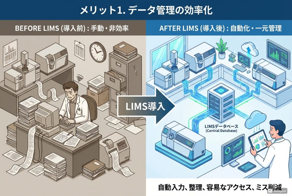 研究者が実験データを手動で記録する代わりに、LIMSは分析機器から直接データを受け取り、自動的にデータベースに保存します。