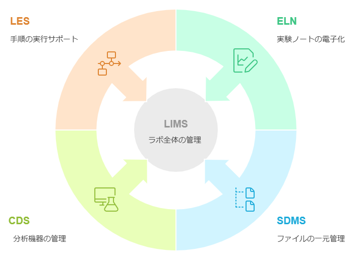LIMSは「ラボ全体の業務フローを統合的に管理する」ための基盤システムですが、ELNやSDMS、CDS、LESなどはそれぞれに特化した役割を持っています。